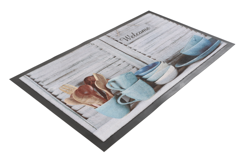 Personalisierte Fußmatte aus Polyamid, Inschrift welcome, Bild Geschirr, auf den Boden zu legen
